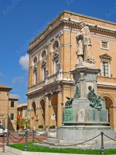 Italy, Marche, Recanati, monumental statue of Leopardi in the town square.