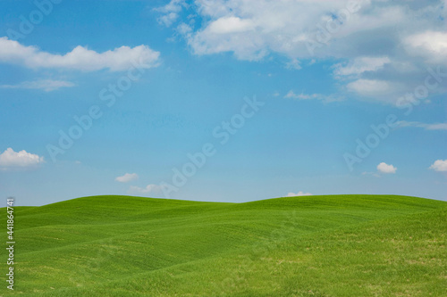 Italy, Tuscany, Val D'Orcia, Green hills under blue sky