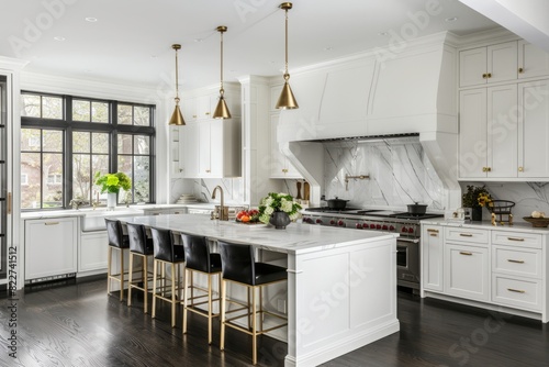 It's a classic kitchen with white cabinets, a marble backsplash and a Jean Stoffer style island.