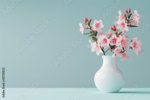 It's a Monet-style photograph of bright bouquets of flowers in a vase on an empty table against a blue wall background.