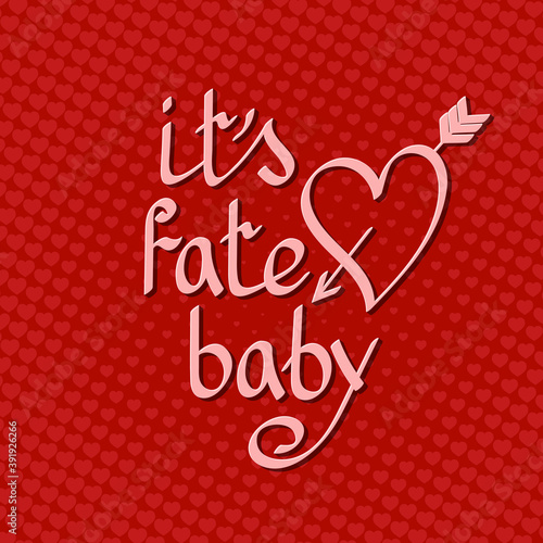 It's fate baby lettering with heart pierced by an arrow symbol on hearts background in pop art style. Greeting card template for Valentine's day.