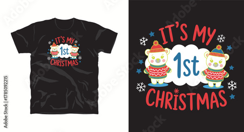 Its My 1st Season T Shirt Vector Illustration Design with Bears and Festive Accents Cute Apparel Graphic for Holiday Season and New Year Celebrations in Red Blue and White