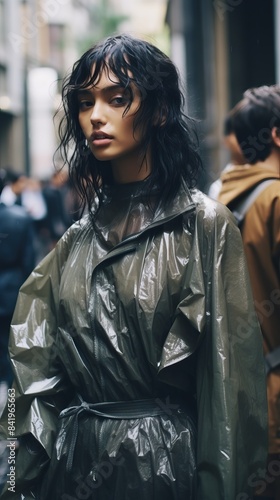 its raining Downpour, Milan Fashion Week, close-up, stylish girls and a guy in oversized clothes in modern street style: loft design on a background of concrete, wood, iron: Fujifilm film