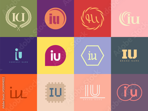 IU logo company template. Letter i and u logotype. Set different classic serif lettering and modern bold text with design elements. Initial font typography.