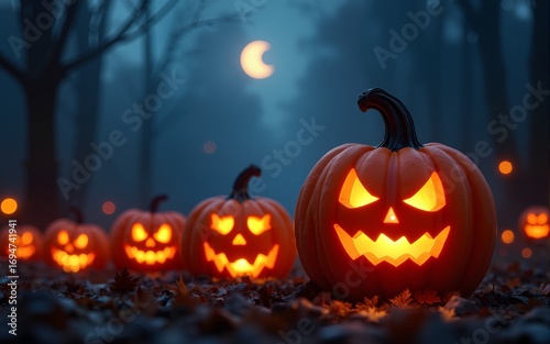 Jack O' Lanterns Glowing In Fantasy Night. Halloween Background. High quality