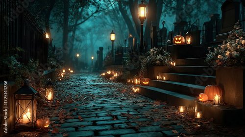 Jack O` Lanterns In Graveyard In The Spooky Night
