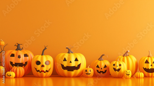 Jack O'Lantern pumpkins on yellow plain background with copy space for text, suit for Halloween background and advertisement.