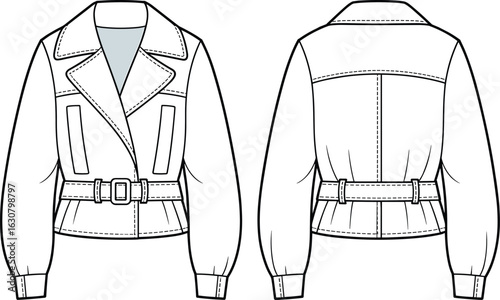Jacket technical drawing, front and back view, wide lapel collar, belted waist, fashion sketch, garment design, clothing illustration, apparel