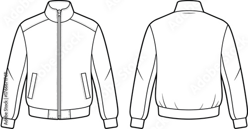 Jacket technical fashion sketch, front and back view, high collar, zipper closure, ribbed cuffs, garment design, clothing illustration, apparel