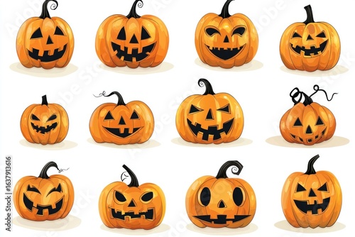 Jack-o-Lantern Pumpkin Set Isolated on White Background. Multiple Carved Halloween Pumpkins Concept. Autumn Harvest Clip Art. Pumpkins with Clipping Path. Fall Season Decoration Design.