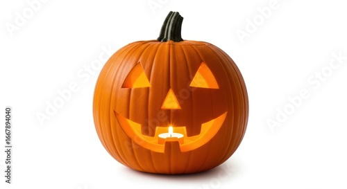 Jack-o'-lantern with glowing candle inside shines brightly for spooky Halloween celebrations
