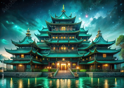 Jade Dragon Palace: Mythical, otherworldly, deep teal, luminescent, grandiose