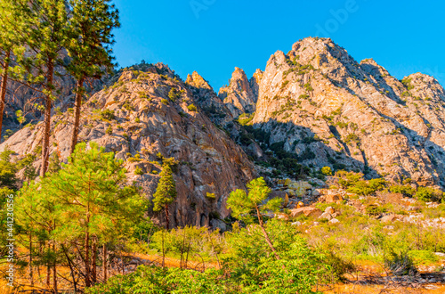 Jagged Mountains in King's Canyon National Park are surrounded by a pine forest.