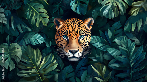 Jaguar trudging through lush jungle vegetation under canopy of leaves, symmetrical. Lush Jungle Canopy. Illustration