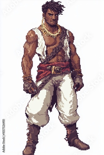 Jamaican pirate hero character with fishbone necklace in pixel art style