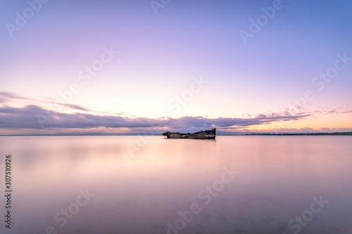 Janie Seddon shipwreck against sky during sunset, Moeraki, New Zealand