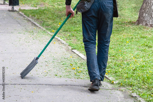 Janitor sweeping a path in an old park on a summer day with a broom. Green cut grass with dandelions.