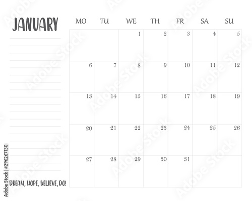 January 2020 calendar planner with to-do list and place for notes in black and white design.