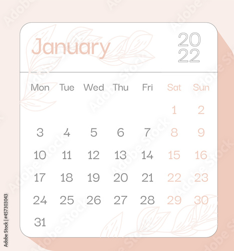 January 2022 calendar month planner with floral pattern, week starts on Monday, template, mock up calendar leaf illustration. Vector graphic page