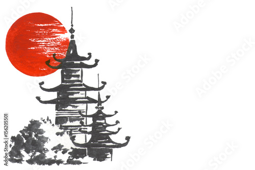 Japan Traditional japanese painting Sumi-e art Temple and sun