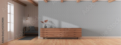 Japandi living room in white and gray tones. Wooden chest of drawers with wall mockup. Parquet and wallpaper. Interior design, panoramic view