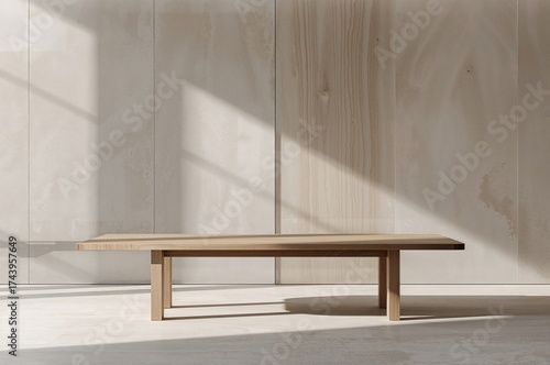 Japandi-Style Wooden Table with Glass Wall Backdrop, Ideal for Product Display and Mockups
