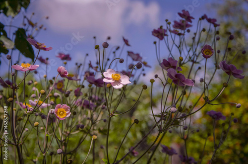 Japanese anemones against the sky, blooming in the garden.