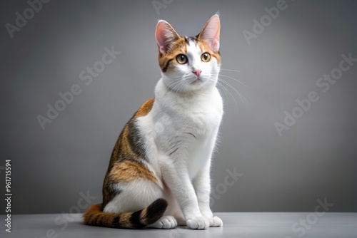 Japanese Bobtail cat sitting upright with its back to the camera, revealing its bobbed tail.