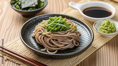 Japanese buckwheat bread with green mustard, seaweed shreds, and scallions, delicious for lunch and dinner