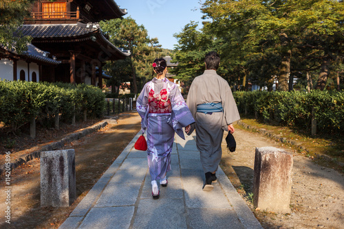 Japanese couple wearing traditional Japanese clothing (kimono) in Kyoto, Japan.