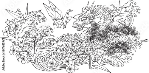 Japanese Dragon and Origami Cranes