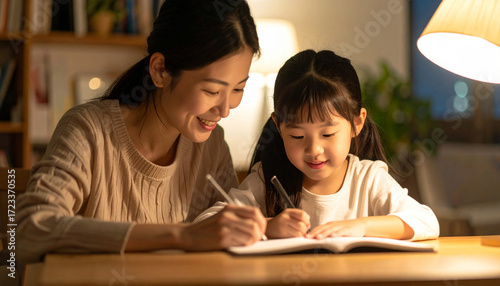 Japanese elementary school girl studying at her desk with her mother at night, cozy warm light, parent helping with homework, family learning moment