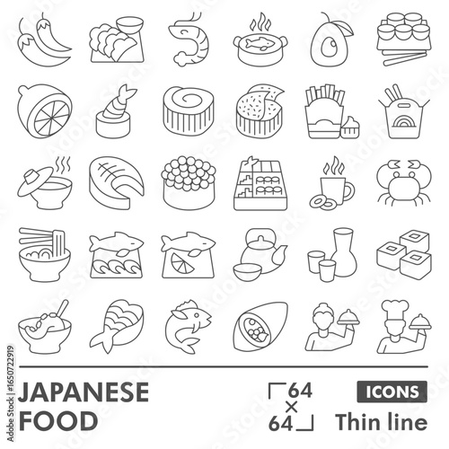 Japanese food symbols collection or sketches, cooking theme with thin line style signs for web and app. Vector graphics isolated on white background.