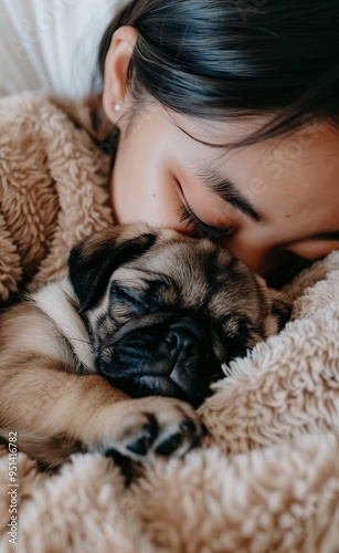 Japanese girl sleeping with pug puppy generated by AI
