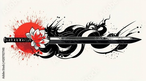 Japanese Katana Sword with Dragon and Lotus Flower Tattoo Design