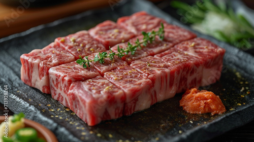 Japanese marbled beef steak. The meat is of very high quality. On the table. Unusual background. With spices and rosemary.