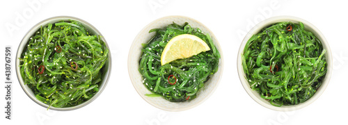 Japanese seaweed salad in bowls on white background, top view. Collage