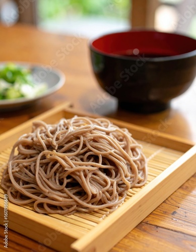 Japanese Soba Noodles on Bamboo Plate with Traditional Miso Soup Bowl