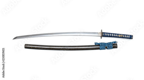 Japanese sword steel fitting and blue cord with scabbard on white background.