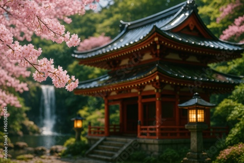 Japanese Temple with Cherry Blossom Tree, Stone Lantern, and Waterfall in Spring Forest