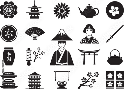 Japanese Traditional Icons in Silhouette on White Background Premium Vector Set