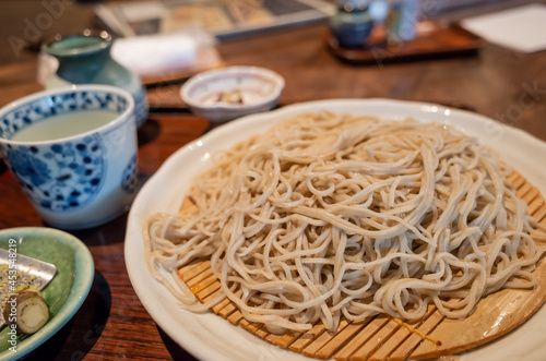 Japanese traditional noodle "zaru soba" served in the restaurant in chikuma city, nagano prefecture, japan
