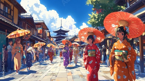 Japanese Women in Kimono with Red and Yellow Umbrellas Walking on a Street in Japan