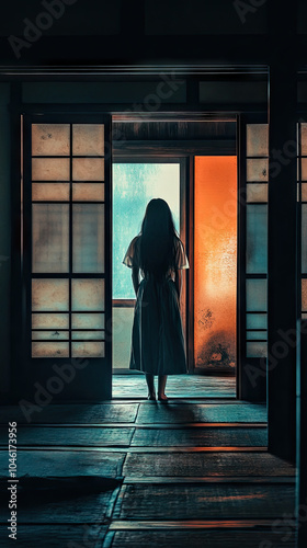 Japanese-style horror, woman’s back view, frightening, shoji doors, dimly lit room.