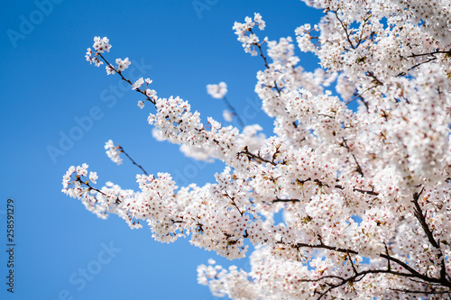 Japanische Kirschblüte im Frühling vor blauem Himmel