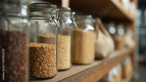 Jars filled with various grains and seeds displayed on rustic wooden shelves in a market