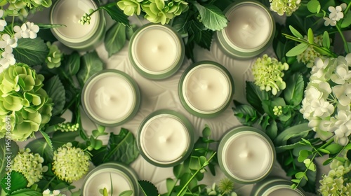 Jars of skin care creams placed among green leaves demonstrate the concept of natural beauty on a bright green floral background.