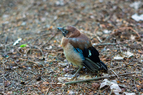 Jay bird standing quietly on forest floor surrounded by dried leaves