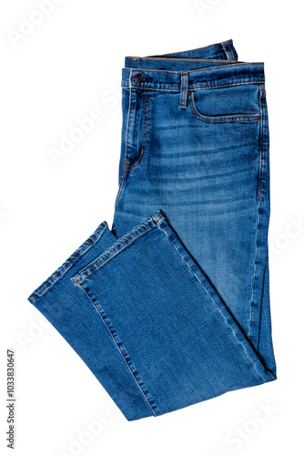 Jeans isolated. Folded trendy stylish blue denim stretch pants or trousers for men isolated on a white background. Clipping path. Jeans summer and autumn fashion.