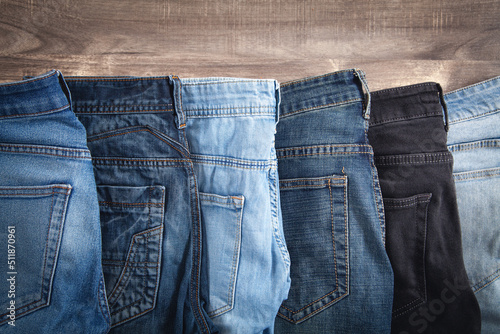 Jeans on the brown wooden background.